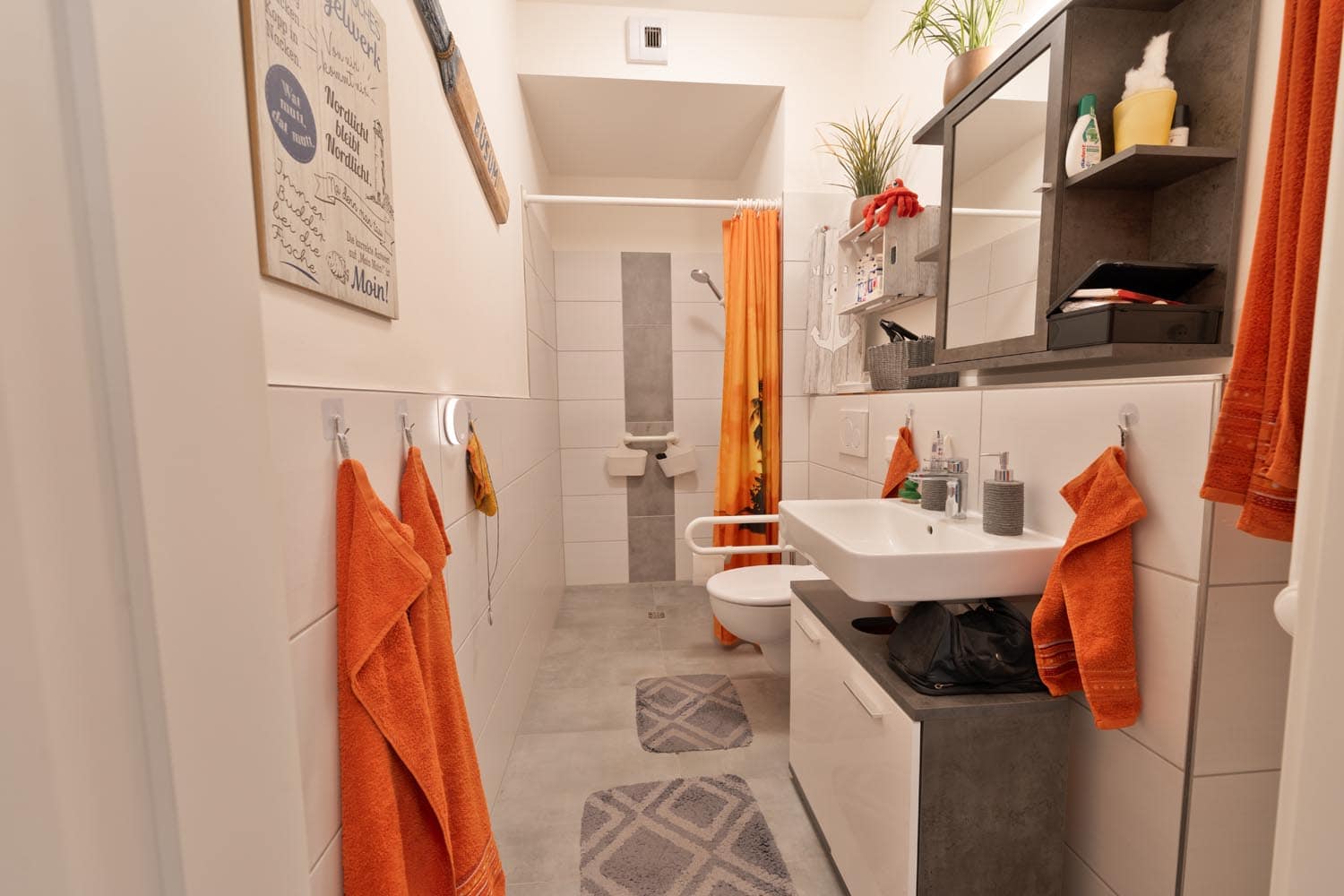 - Dusch- bzw. Wannenbad mit WC, Waschbecken und Anschluss für eine Waschmaschine