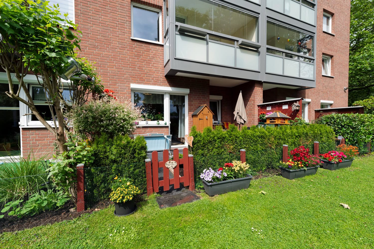 Unser Seniorenhaus im Hamburger Bezirk Wandsbek liegt an einer verkehrsberuhigten Straße, umgeben von einer parkähnlichen Grünanlage.